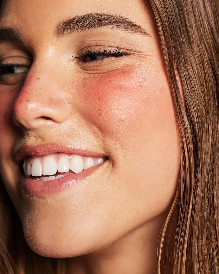 Close-up of smiling model with curly hair wearing the Glass Lips look